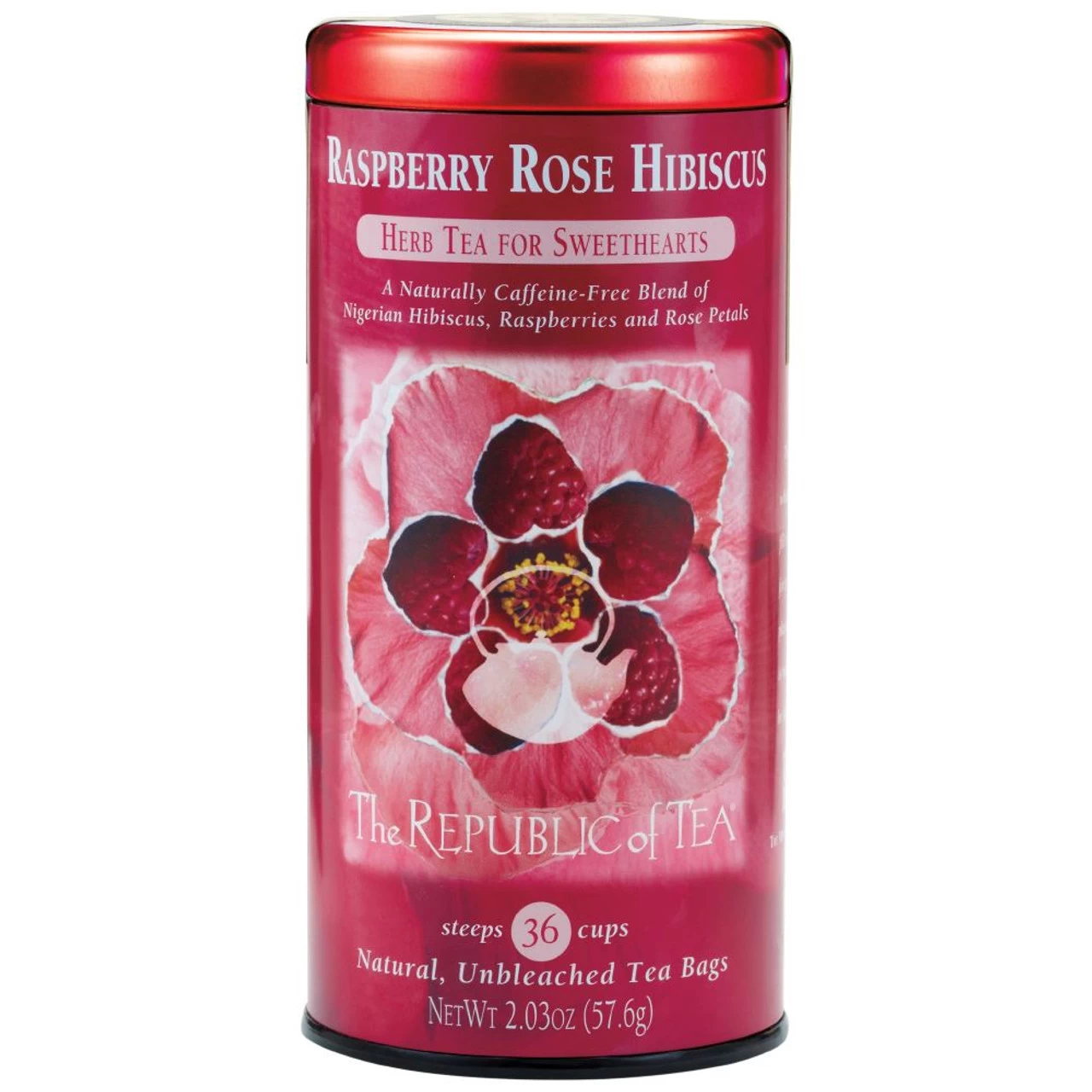 Nigerian hibiscus, rosehip peels, apples, stevia, natural raspberry, natural rose and vanilla flavors and rose petals